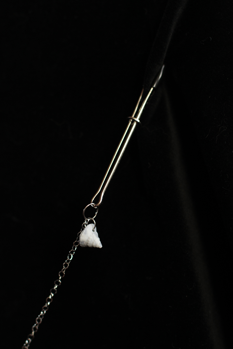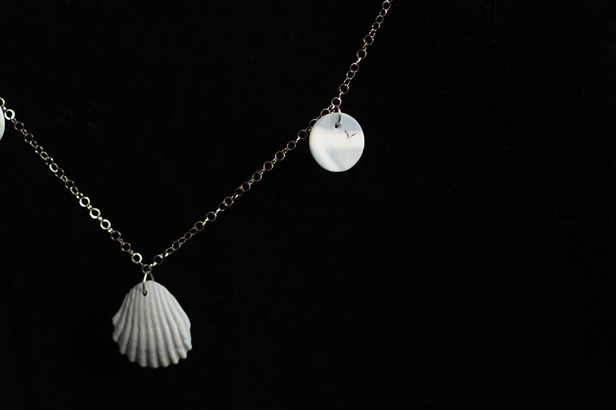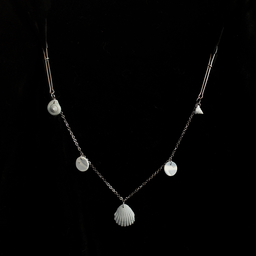 Cast in a misty blueish grey and white porcelain, three differently shaped shells and two coins with silver colored stainless steel hardware. True one of a kind.