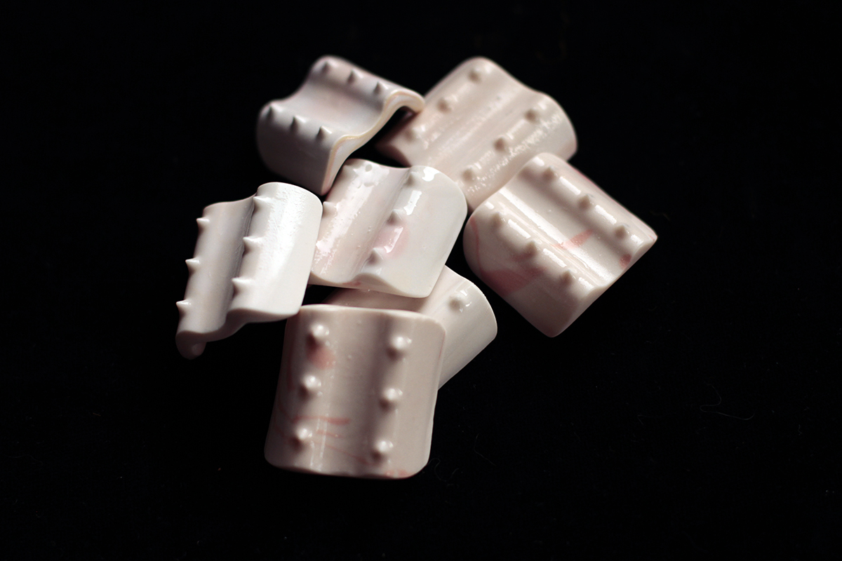 Rope blocks are great to add a little edge to your rope restraints or shibari. They measure +- 3,5 x 3,5 cm. The side with the points is glazed for easier cleaning. The side the rope rests in is unglazed to provide some tooth to hold onto. I advice against putting to much body weight on it, but to let the rope provide the pressure needed. The material is cast thick and while it’s very strong and almost unbreakable it can get damaged when it comes in contact with a hard surface. Please store in something soft like a cloth where it cannot be damaged by something hard. If it sustains any damage or exhibits chipping, discontinue its usage immediately.